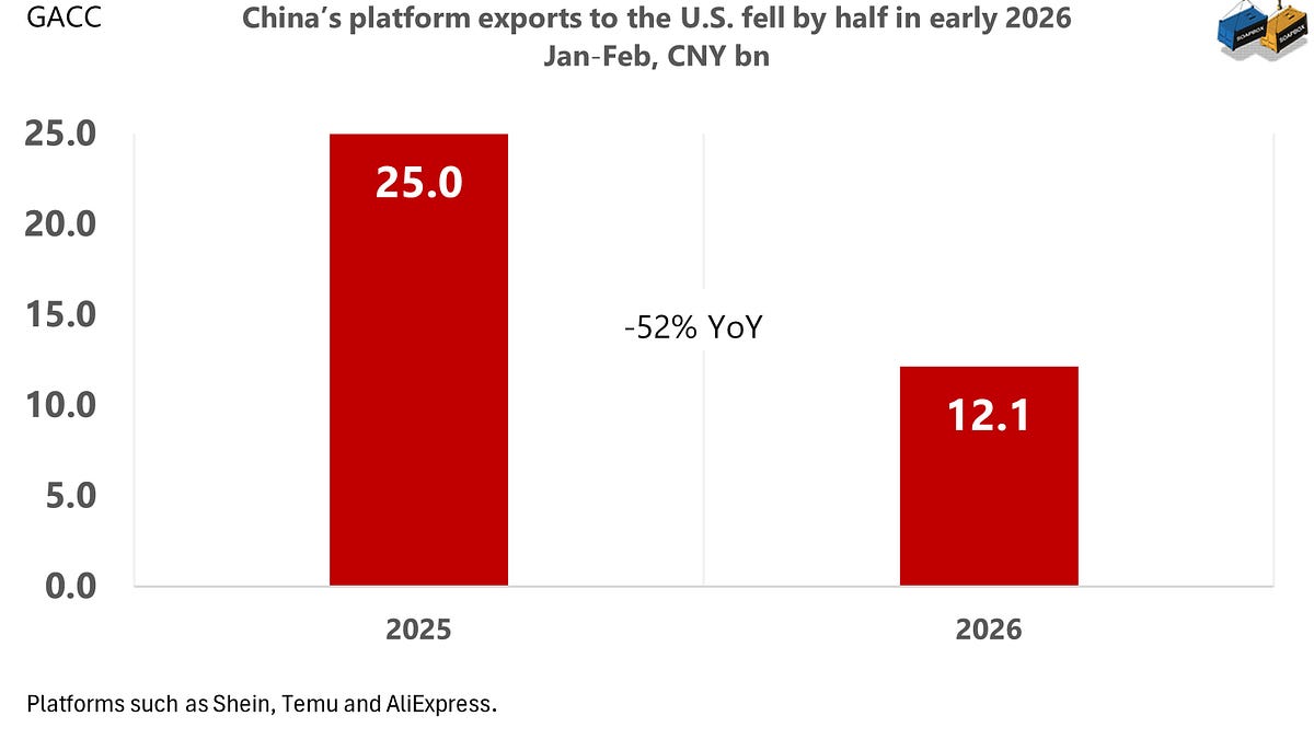 Администрацията на Тръмп затвори безмитните магазини de minimis маршрут за внос с ниска стойност от Китай и Хонг Конг през май 2025 г., по-късно разшири спирането и продължи затягането на правоприлагането в началото на 2026 г. Износът на платформата на Китай за САЩ не просто се забави. Те бяха разполовени.