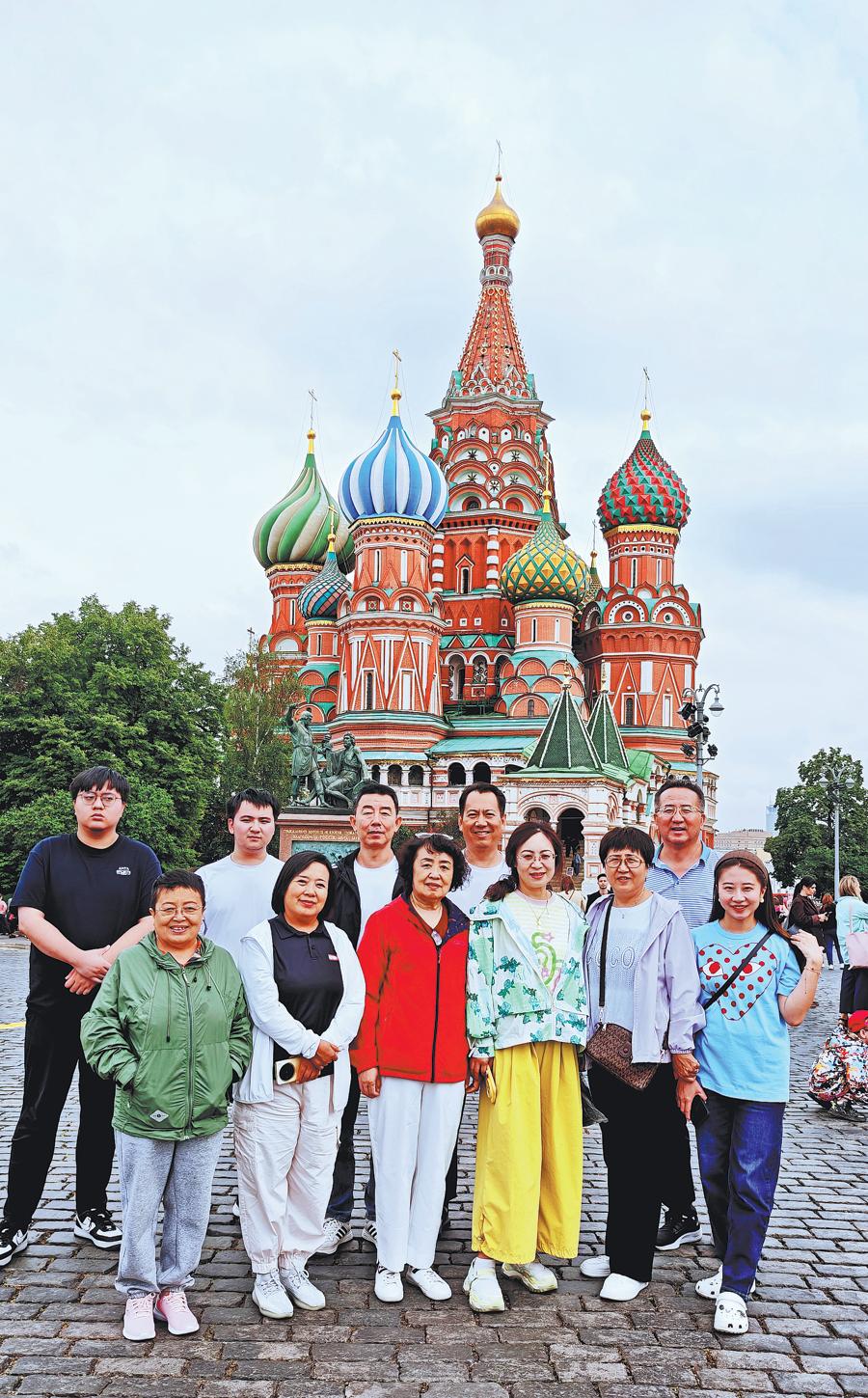 Туристите от международното летище Датонг Юнганг позират за групова снимка пред Кремъл в Москва, Русия. Китай ежедневно