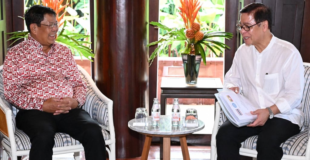 Министрите на външните работи Сихасак Пхуангкеткеоу (вдясно) и Тан Шве обсъждат отношенията между Тайланд и Мианмар в сряда. Снимка: Министерство на външните работи / Ройтерс