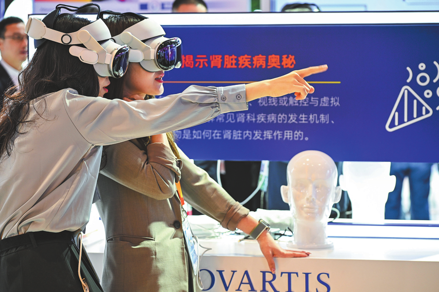Посетителите използват VR слушалки, за да изследват медицинските предложения на Novartis на осмото Китайско международно изложение за внос в Шанхай през ноември. CHINA DAILY